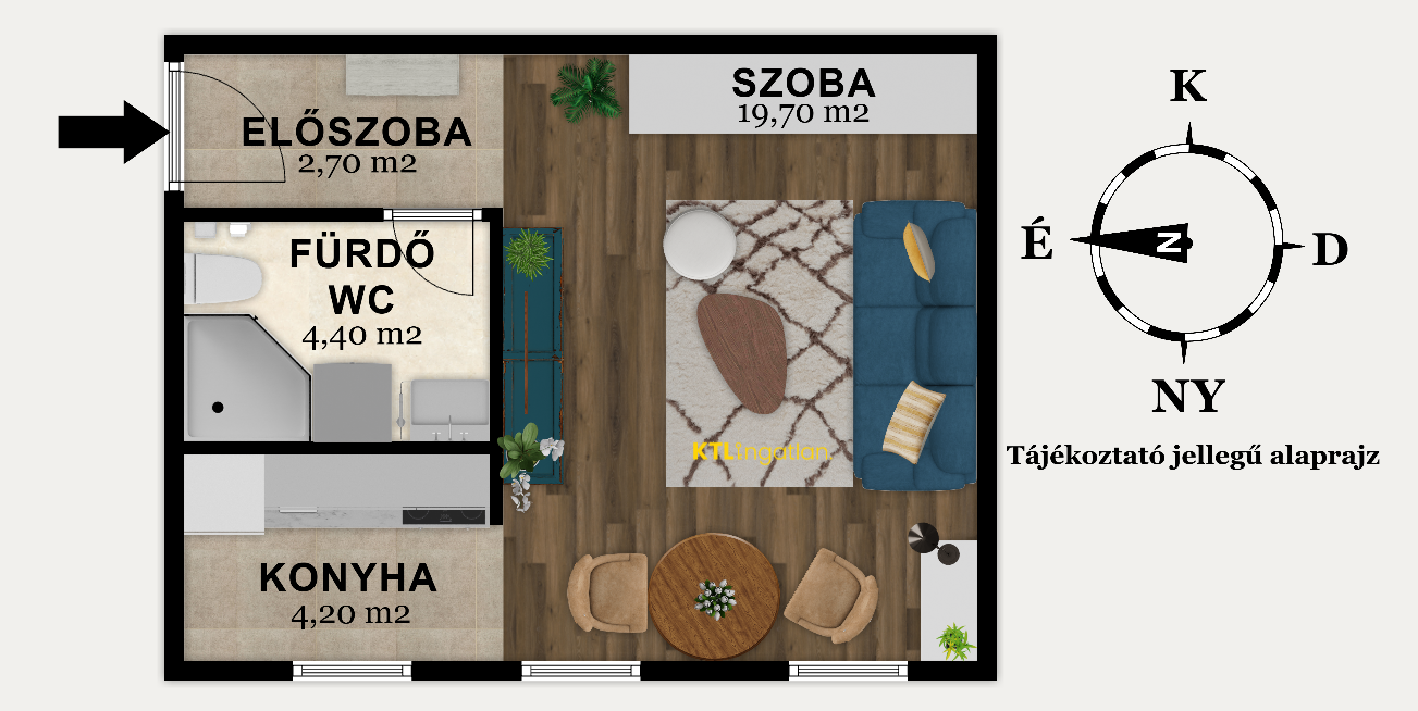 – egyszobás kialakítás az alábbi helyiségekkel: nappali (19,7 nm), konyha (4,2 nm) fürdőszoba (4,4 nm), előszoba (2,7 nm), összesen: 31 nm